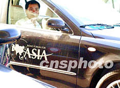 二○○四年四月二十二日,由遼寧沈陽華晨集團(tuán)提供的九十七輛“中華車”穿梭于博鰲水城,為亞洲論壇年會(huì)的與會(huì)來賓、工作人員服務(wù)!爸腥A車”此次投入服務(wù)的主要型號(hào)為2.0和2.4兩款。圖為會(huì)議中心門前印有醒目博鰲論壇標(biāo)志的中華汽車。作者:邱江波