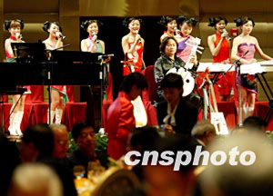 四月二十三日,海南省人民政府舉行晚宴歡迎出席博鰲亞洲論壇2004年年會(huì)的嘉賓,來自廣東的芳華十八另類女子民樂隊(duì)為晚宴助興。中新社記者:鄭萍萍