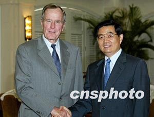 中新社博鰲四月二十三日電(記者 阮煜琳 關(guān)向東 王辛莉)中國(guó)國(guó)家主席胡錦濤二十三日下午在海南博鰲會(huì)見了前來(lái)參加博鰲亞洲論壇二OO四年年會(huì)的美國(guó)前總統(tǒng)喬治·布什,并表示,我們?cè)竿婪揭坏,牢牢把握中美關(guān)系大局,加強(qiáng)交往和合作,妥善處理兩國(guó)關(guān)系中的問題,推動(dòng)中美關(guān)系繼續(xù)穩(wěn)定發(fā)展。