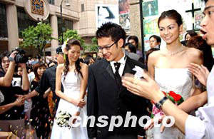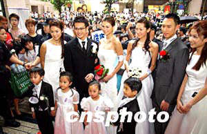 日本美容品牌Miryoku在香港首度開設(shè)Miryoku Beauty Salon美容院,4月24日舉行開幕儀式,邀請(qǐng)城中藝人吳浩康[左二]、陳鍵鋒[右二]、名模Rosemary[左三]和李嘉慧[右三]出席,俊男美女穿上婚紗禮服在花童和伴娘的襯托下,由鬧市步入會(huì)場。作者:洪少葵