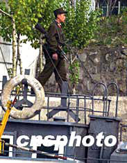 四月二十四日下午,一名持沖鋒槍的朝鮮士兵在與中國丹東隔鴨綠江相望的碼頭巡邏。中新社記者:宋吉河