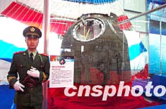 “中國(guó)·綿陽(yáng)科技城科技博覽會(huì)暨軍轉(zhuǎn)民高科技成果交易會(huì)”四月二十六日在四川綿陽(yáng)市開(kāi)幕,“神舟五號(hào)”載人飛船返回艙亮相此次科技盛會(huì)。作者:陳雯