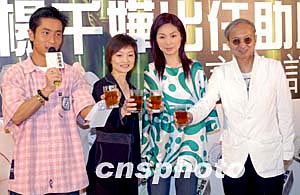 歌影紅星楊千嬅4月27日在香港正式簽約成為瘦身產(chǎn)品《助助身茶》代言人,助助茶氣有限公司高層(左二)與楊千嬅及其經(jīng)理人黃柏高(右)以《助助身茶》代酒慶祝,順道宣傳產(chǎn)品。作者:鄧慶樂