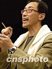 香港話劇團(tuán)2004/05年春夏劇第一炮《桃花扇》,四月二十九日舉行宣傳活動(dòng),該劇將于五月中旬在在香港大會(huì)堂劇院上演,圖為香港話劇團(tuán)藝術(shù)總監(jiān)毛俊輝為該劇造勢(shì)。 作者:錢興強(qiáng)