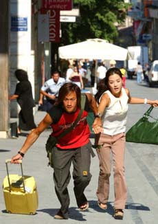 這場驚心動魄的追逐戲在雅典市中心憲法廣場拍攝,由于現(xiàn)場人潮擁擠,許多人根本不曉得在拍戲,加上何潤東與蔡琳拎個(gè)大卡行李箱,活像對亡命鴛鴦,引起很多路人側(cè)目。