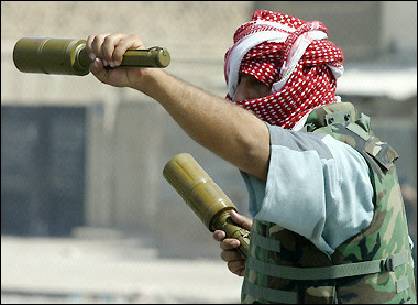 據(jù)法新社報道 在巴格達什葉派社區(qū)薩德爾城,一名效忠于什葉派宗教領(lǐng)袖薩德爾的民兵正拿著兩個拄型手榴彈站在薩德官邸附近。(固山)