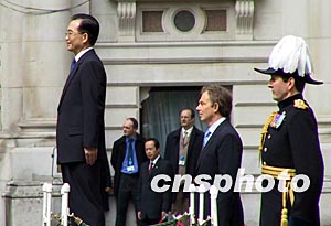 當(dāng)?shù)貢r(shí)間五月十日,英國(guó)首相布萊爾舉行儀式歡迎中國(guó)總理溫家寶。作者:朱大強(qiáng)