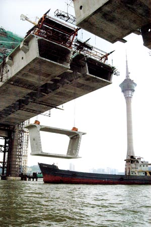 中新網(wǎng)5月12日電 據(jù)澳門日報(bào)報(bào)道,澳門第三大橋工程進(jìn)展順利,預(yù)計(jì)主航道對上的橋面可在短期內(nèi)完成。