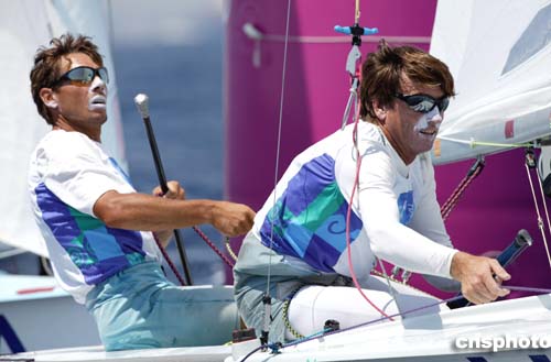 圖為當(dāng)?shù)貢r間8月18日舉行的男子雙人皮劃艇比賽中,美國選手Paul Foerster和Kevin Burnham。