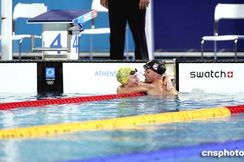 圖為在當(dāng)?shù)貢r(shí)間19日舉行的女子自由泳100米比賽后,荷蘭選手Inge de Bruijn擁抱獲得冠軍的澳大利亞選手Jodie Henry以示祝賀。