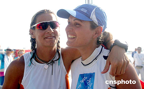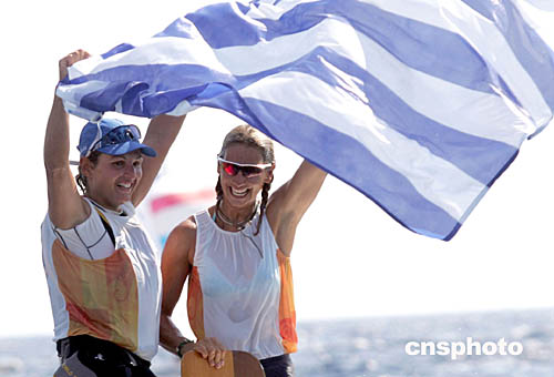 在當(dāng)?shù)貢r(shí)間舉行的女子470級(jí)帆船帆板比賽中,希臘選手BEKATOROU SOFIA和SOULFA AIMILIA榮獲冠軍。