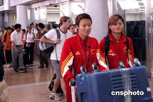 八月二十日下午四時(shí),在雅典奧運(yùn)會(huì)遭受空前挫折的中國(guó)女足返抵北京首都機(jī)場(chǎng),女足隊(duì)員與教練步出機(jī)場(chǎng)之際,濃濃的悲愴之情籠罩候機(jī)大廳。圖為國(guó)家體育總局有關(guān)領(lǐng)導(dǎo)前往機(jī)場(chǎng)迎接。作者:徐曦弋