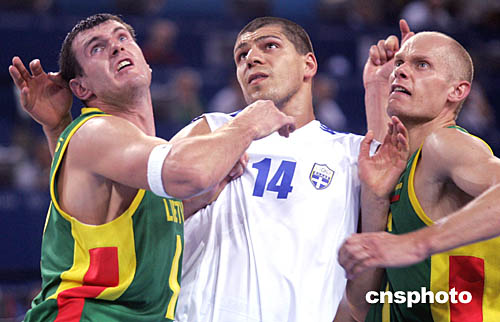 在當(dāng)?shù)貢r(shí)間8月19日舉行的男子籃球賽中,14號希臘選手Lazaros Papadopoulos被立陶宛兩名選手防住,很難脫身。