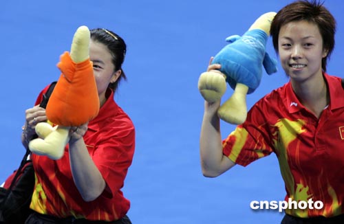 當(dāng)?shù)貢r間8月20日下午,中國乒乓球選手王楠、張怡寧在決賽中以4比0輕取韓國選手,獲得本屆奧運會女子雙打冠軍。中新社記者:任晨鳴