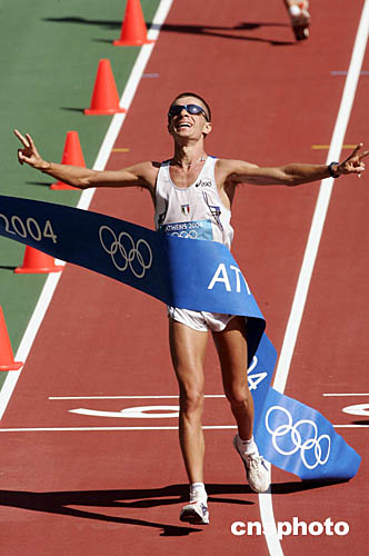 在當?shù)貢r間8月20日舉行的男子20公里競走比賽中,意大利選手布魯格內(nèi)蒂奪金。圖為他在沖過終點后歡呼的鏡頭。