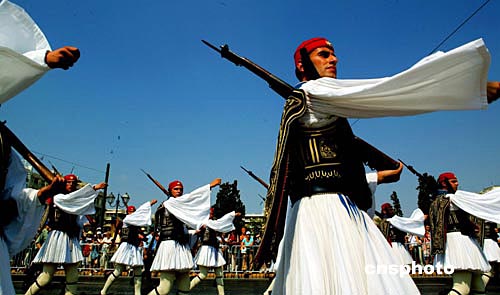 在雅典無(wú)名戰(zhàn)士紀(jì)念碑前站崗的希臘王家衛(wèi)隊(duì)衛(wèi)兵,身著當(dāng)年?duì)幦∶褡濯?dú)立戰(zhàn)爭(zhēng)時(shí)期山區(qū)戰(zhàn)士的裝束。成為一名王家衛(wèi)隊(duì)衛(wèi)兵是很多希臘青年的夢(mèng)想。中新社記者:王瑤
