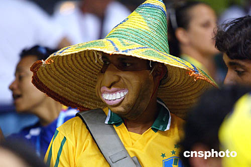 圖為在當?shù)貢r間8月20日舉行的希臘隊與巴西隊的排球比賽中,一個球迷帶著古怪的面具為自己球隊加油。