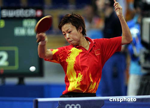 張怡寧面對(duì)善于打旋轉(zhuǎn)球的韓國(guó)選手金景娥表現(xiàn)得十分冷靜,五局的比分是13:11、11:8、11:5、5:11、11:8。
