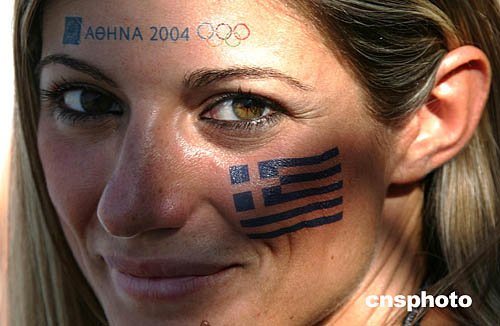 圖為在當(dāng)?shù)貢r(shí)間8月20日舉行的女子50米自由泳比賽中,一位描畫著希臘國(guó)旗的支持者來(lái)為選手們加油。