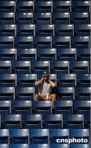 圖為在當(dāng)?shù)貢r(shí)間8月20日舉行的女子50米自由泳比賽中,偌大一個(gè)看臺只有一名觀眾。
