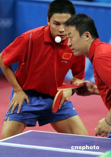 當(dāng)?shù)貢r(shí)間八月二十一日下午,中國(guó)乒乓球選手馬琳、陳玘在男雙決賽中以4:1戰(zhàn)勝香港選手李靜、高禮澤,獲得本屆奧運(yùn)會(huì)男子雙打冠軍。中新社記者:任晨鳴