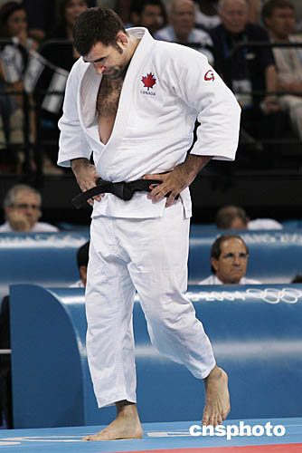 在男子100公斤級(jí)柔道比賽中,加拿大選手NICOLAS GILL在第一回合就惜拜于意大利選手Michele Monti,神情落寞的走出賽場(chǎng)。