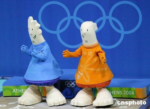 雅典奧運舉重男子八十五公斤級比賽于當(dāng)?shù)貢r間8月21日晚舉行。比賽間隙,雅典奧運吉祥物"雅典娜"和"費沃斯"在舉重臺上表演。中新社記者:宋方燦