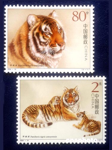 中國(guó)國(guó)家郵政局于八月二十三日發(fā)行《華南虎》特種郵票一套二枚,這兩枚郵票的名稱均為華南虎,面值分別為八十分與二元。全世界的現(xiàn)生虎只有一種,而華南虎是其中一個(gè)亞種的俗稱,僅分布于中國(guó)長(zhǎng)江以南。華南虎體形較小,黑色條紋較寬,屬極度瀕危動(dòng)物,其野生種群不足三十只,在中國(guó)的動(dòng)物園內(nèi)也只有五十只,與大熊貓同被列入國(guó)際自然與自然保護(hù)聯(lián)盟(IUCN)十大瀕危物種之列。中新社記者:鄒憲
