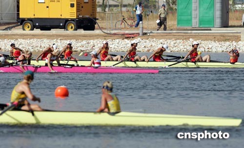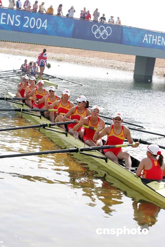 當(dāng)?shù)貢r(shí)間八月二十二日,參加雅典奧運(yùn)女子八人單槳有舵手賽艇比賽的中國隊(duì)獲得第四名。中新社記者:毛建軍