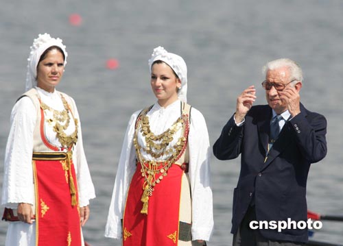 當?shù)貢r間八月二十二日,國際奧委會前主席薩馬蘭奇出席賽艇比賽頒獎儀式。中新社記者:毛建軍