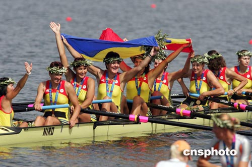 當(dāng)?shù)貢r(shí)間八月二十二日,羅馬尼亞隊(duì)獲得雅典奧運(yùn)女子八人單槳有舵手賽艇比賽金牌。中新社記者:毛建軍