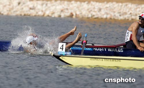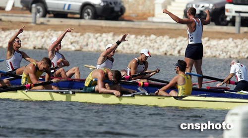 當(dāng)?shù)貢r(shí)間八月二十二日,美國隊(duì)在雅典奧運(yùn)八人單槳有舵手比賽中得勝,隊(duì)員們到達(dá)終點(diǎn)高唱?jiǎng)P歌。中新社記者:毛建軍