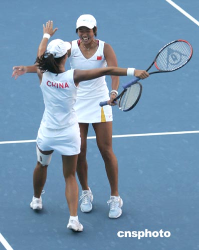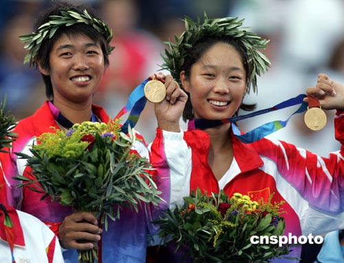 雅典時(shí)間8月22日傍晚,中國(guó)網(wǎng)球選手孫甜甜、李婷(左)在奧運(yùn)會(huì)女子雙打決賽中以二比零戰(zhàn)勝西班牙選手,令人震驚地獲得冠軍。中新社記者:任晨鳴