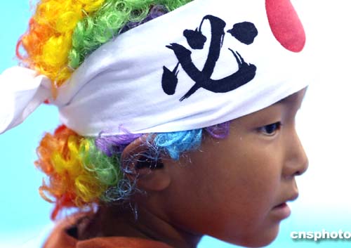當地時間8月22日舉行的女子72公斤級摔交比賽場邊,一個打扮引人注目的小孩在為自己國家的運動員們加油。