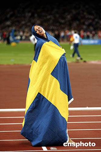 圖為瑞典選手克魯夫特(Kluft Carolina)在獲得女子七項(xiàng)全能冠軍后,身披國(guó)旗以示慶祝的畫面。