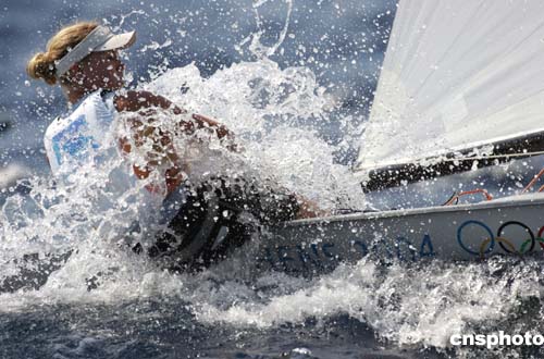 圖為當(dāng)?shù)貢r(shí)間8月20日舉行的帆船帆板女子歐洲級(jí)比賽中,挪威運(yùn)動(dòng)員Siren的表現(xiàn)。