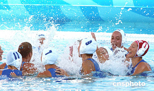 在當(dāng)?shù)貢r(shí)間8月22日舉行的女子水球賽中,希臘隊(duì)以7比4戰(zhàn)勝俄羅斯。圖為隊(duì)員們歡慶勝利的場(chǎng)面。