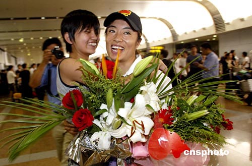 8月23日,在雅典奧運(yùn)會(huì)自行車女子500米計(jì)時(shí)賽中奪得銀牌的中國老將江永華(右)回到北京,在首都國際機(jī)場(chǎng)受到熱烈歡迎。中新社記者:盛佳鵬