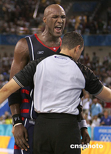 圖為美國(guó)籃球隊(duì)選手拉馬爾-奧多姆(Lamar Odom)對(duì)裁判的判罰相當(dāng)不滿。