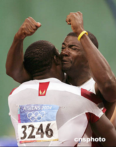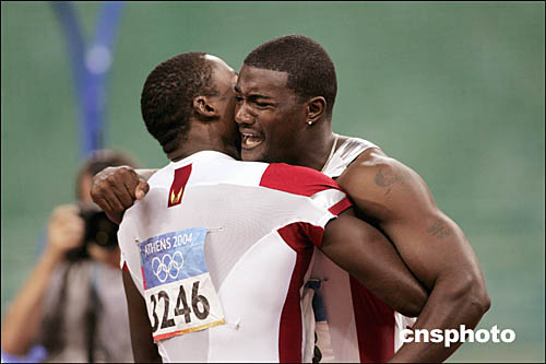 圖為美國選手加特林(Justin Gatlin)在勇奪男子百米冠軍后緊緊擁抱師出同門的肖恩·克勞福德(Shawn Crawford)