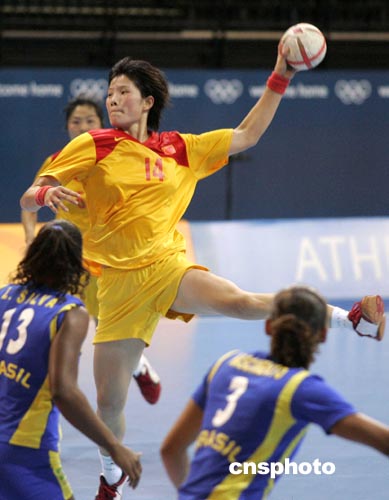 當地時間8月23日下午,在雅典奧運女子手球比賽中,中國女子手球隊(黃)以28比23力克巴西隊。中新社記者:張煒