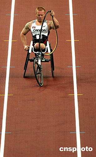 圖為在當(dāng)?shù)貢r(shí)間8月22日舉行的男子1500米輪椅表演賽中,加拿大選手Jeffrey Adams在摔倒在地后毅然爬起繼續(xù)比賽,體現(xiàn)了奧運(yùn)不屈不饒的精神。