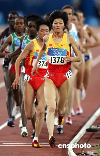 當?shù)貢r間八月二十三日晚,在雅典奧運女子五千米跑決賽中,孫英杰(左)和邢慧娜僅僅獲得第八和第九名。沖金希望破滅。圖為邢慧娜在領跑。中新社記者:毛建軍