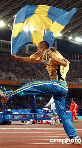圖為瑞典選手霍爾姆(Stefan Holm)在男子跳高比賽中異常興奮。