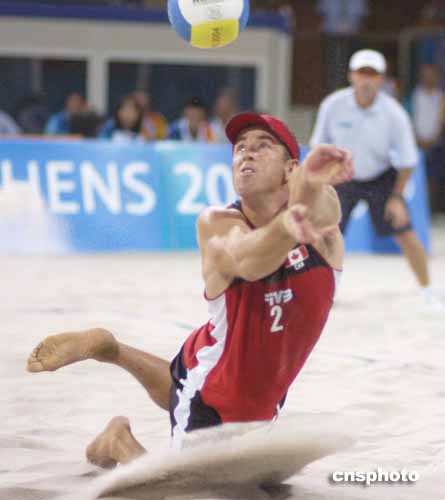 圖為在當(dāng)?shù)貢r(shí)間8月21進(jìn)行的沙灘排球賽中,運(yùn)動(dòng)員飛身救球的場(chǎng)面。
