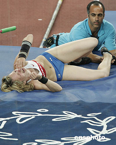 圖為俄羅斯選手ANASTASIYA IVANOVA在撐竿跳比賽時腿部受傷時的畫面。
