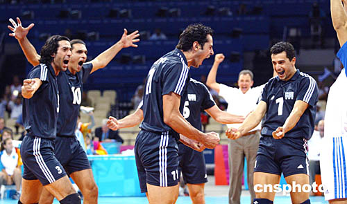 圖為塞黑隊(duì)苦戰(zhàn)5局戰(zhàn)勝東道主希臘隊(duì)后隊(duì)員們慶祝的場(chǎng)面。