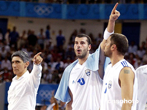 圖為在當(dāng)?shù)貢r(shí)間8月23日舉行的男子籃球賽希臘對(duì)陣波多黎哥中,希臘教練Panagiotis GIANNAKIS指揮隊(duì)員們比賽的場景。