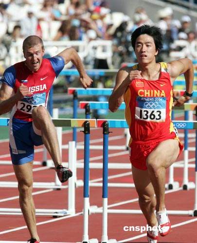 當(dāng)?shù)貢r(shí)間八月二十四日,中國(guó)著名田徑選手劉翔(右)亮相雅典奧運(yùn)賽場(chǎng),在男子一百一十米跨欄預(yù)賽中,以十三秒二七的成績(jī)名列小組第一進(jìn)入第二輪預(yù)賽。中新社記者:毛建軍