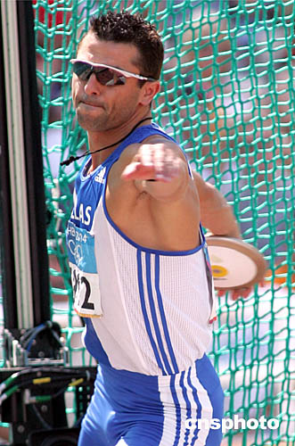 圖為希臘選手Prodromos KORKIZOGLOU在男子十項(xiàng)全能鐵餅比賽中奮力一擲顯本色。